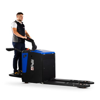 Nasz paleciak elektryczny RUN z podestem to wydajny model Pro do intensywnego, codziennego użytku w pomieszczeniach.
